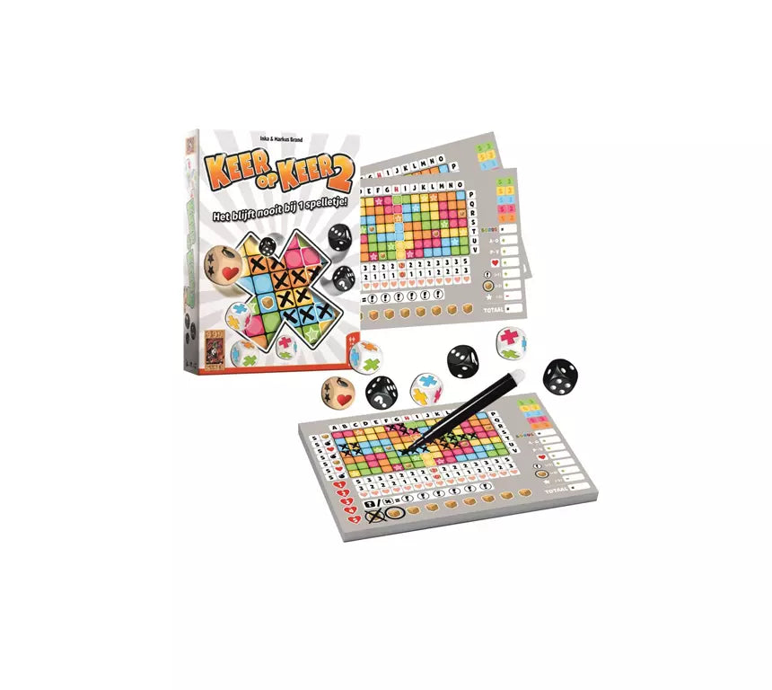 « 2 » reprend là où Keer op Keer s'arrête. De nouveaux dés et de nouvelles options offrent de nouveaux défis. Par exemple, un joueur peut désormais choisir de lancer le septième dé pendant son tour. Par exemple, la bombe barre quatre cases n'importe où, et le cœur rapporte des points supplémentaires pour une colonne complétée. Lancez les dés !
